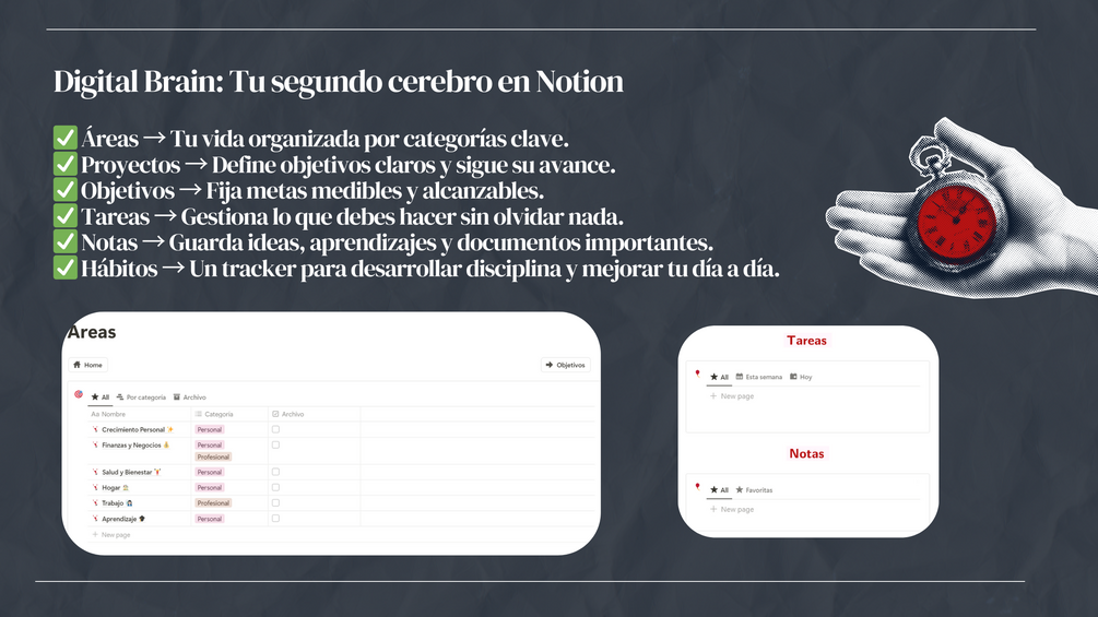 Con Digital Brain, tendrás un sistema estructurado en Notion que te permitirá capturar, organizar y procesar información sin esfuerzo, para que tu mente se enfoque en lo realmente importante.