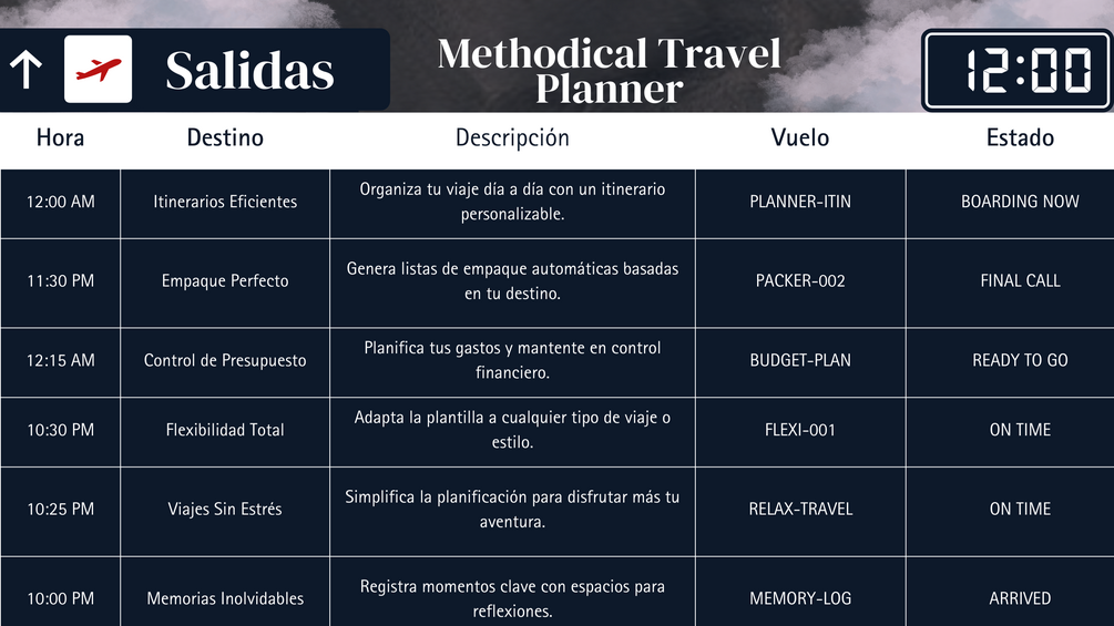 Imagina tener cada detalle de tu viaje perfectamente organizado en un solo lugar. Con Methodical Travel Planner, conviertes esa idea en realidad.