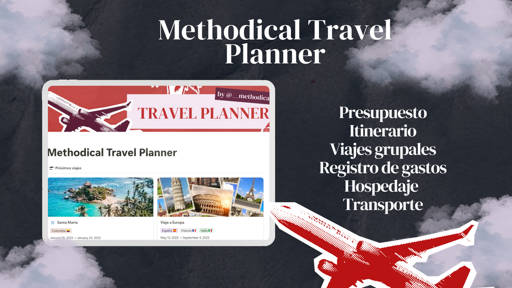 ✈️ Methodical Travel Planner es la plantilla perfecta para planificar viajes sin estrés. 📅 Organiza tu presupuesto, gastos, itinerario, hospedaje y transporte en un solo lugar. 💼 Ideal para viajeros organizados y aventureros que buscan disfrutar al máximo. ¡Empieza a viajar con propósito hoy! 🌍✨